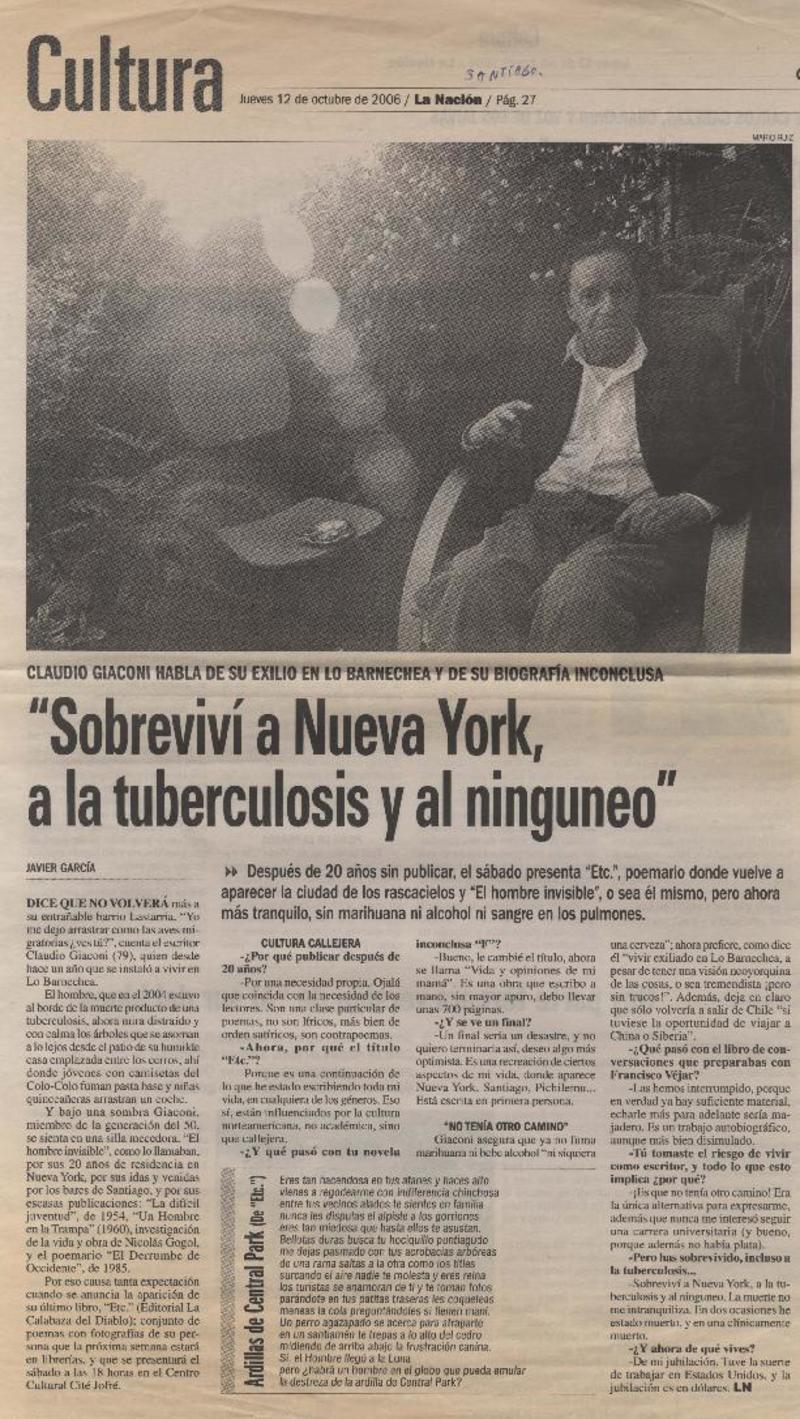 "Sobreviví a Nueva York, a la tuberculosis y al ninguneo" [artículo] Javier García.