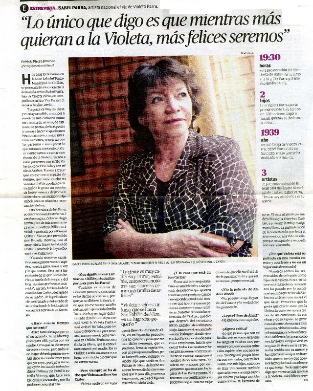 "Lo ùnico que digo es que mientras màs quieran a la Violeta, màs felices seremos" (entrevista) [artículo] Patricia Fierro Jimènez.