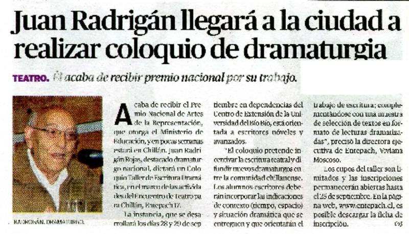 Juan Radrigàn llegarà a la ciudad a realizar coloquio de dramaturgia [artículo]