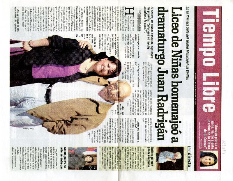 Liceo de niñas homenajeó a dramaturgo Juan Radrigán [artículo] Patricia Fierro Jiménez.