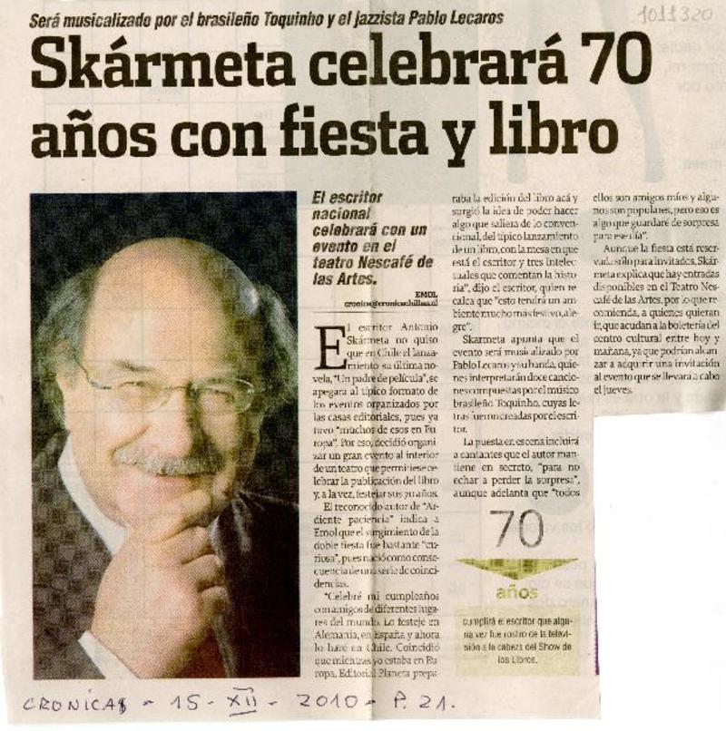 Skármeta celebrará 70 años con fiesta y libro [artículo].