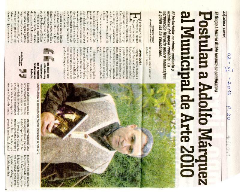 Postulan a Adolfo Márquez al Municipal de Arte 2010 [artículo] Patricia Fierro.