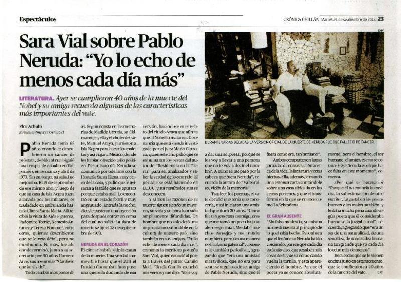 Sara Vial sobre Pablo Neruda: "yo lo echo de menos cada día más" [artículo] Flor Arbulú.