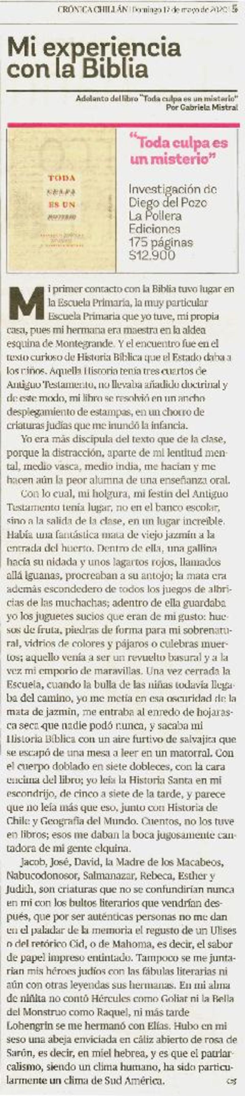 Autoras chilenas - Autores chilenos - Mistral, Gabriela - Pozo, Diego del - Toda culpa es un misterio
