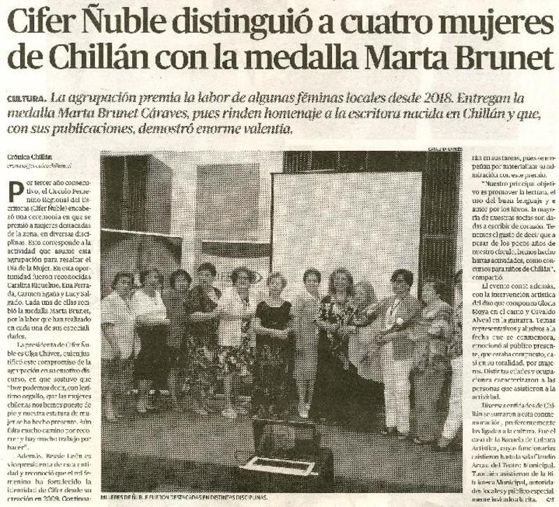 Cifer Ñuble distinguió a cuatro mujeres de Chillán con la medalla Marta Brunet [artículo]