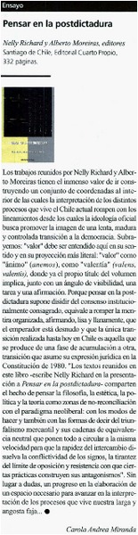 Pensar en la postdictadura [artículo] Carola Andrea Miranda.