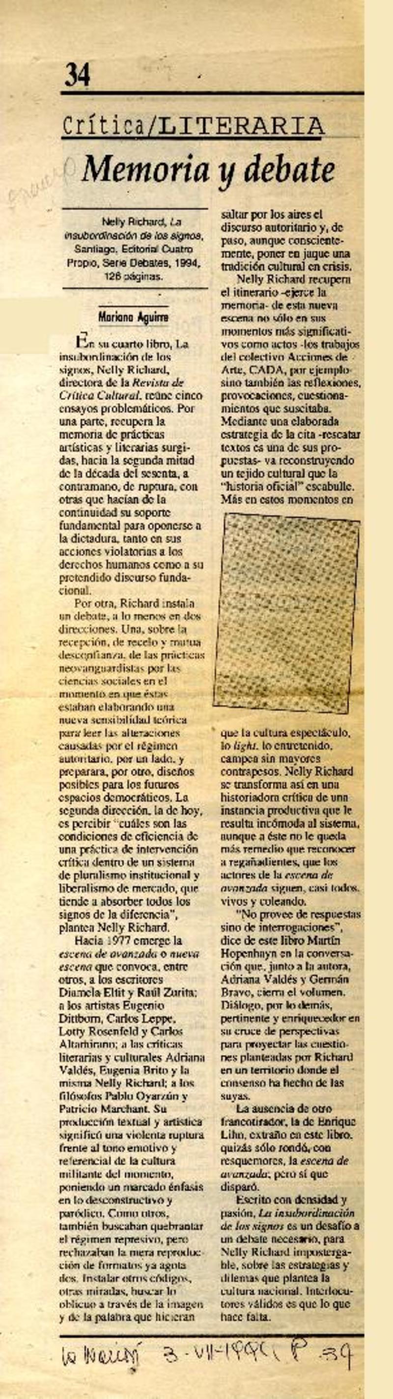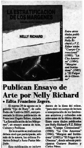 Publican ensayo de arte por Nelly Richard. [artículo]