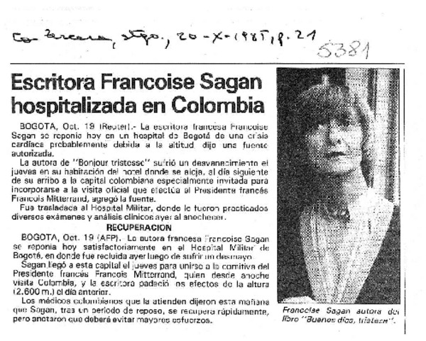 Escritora Françoise Sagan hospitalizada en Colombia [artículo]
