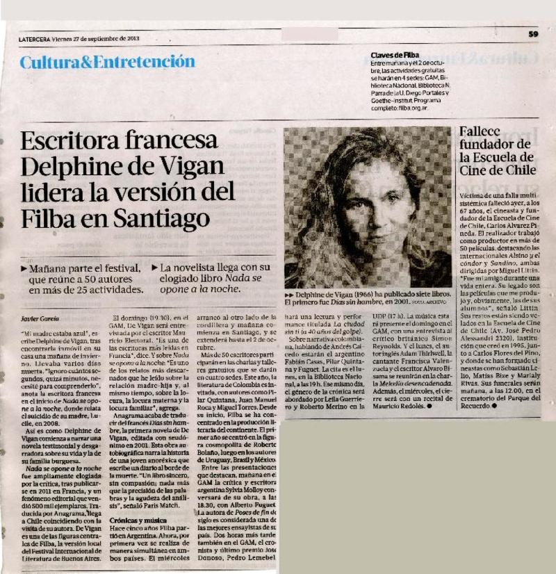 Escritora francesa Delphine de Vigan lidera la versión en Santiago [artículo] Javier García