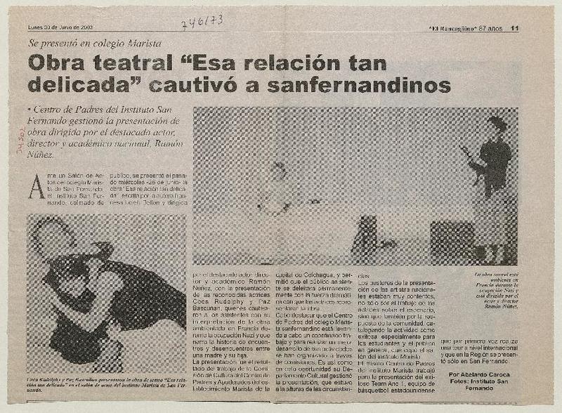 Obra teatral "esa relación tan delicada" cautivó a sanfernandinos [artículo] Abelardo Caroca.