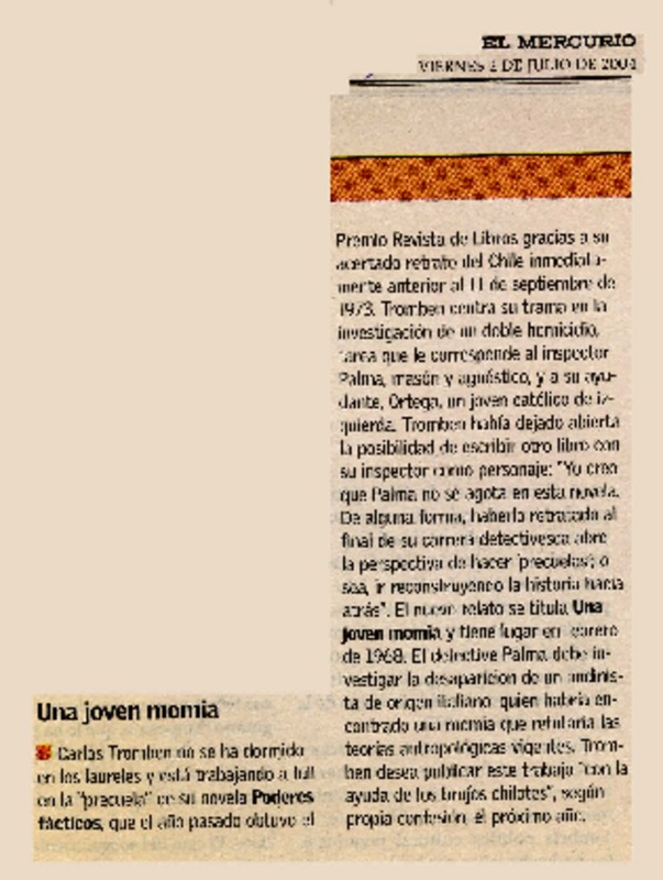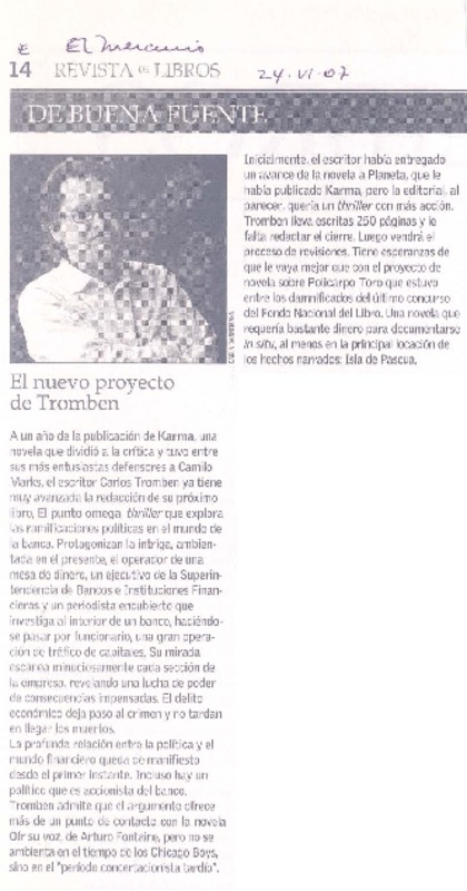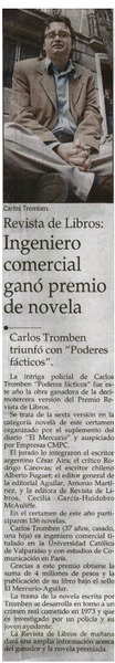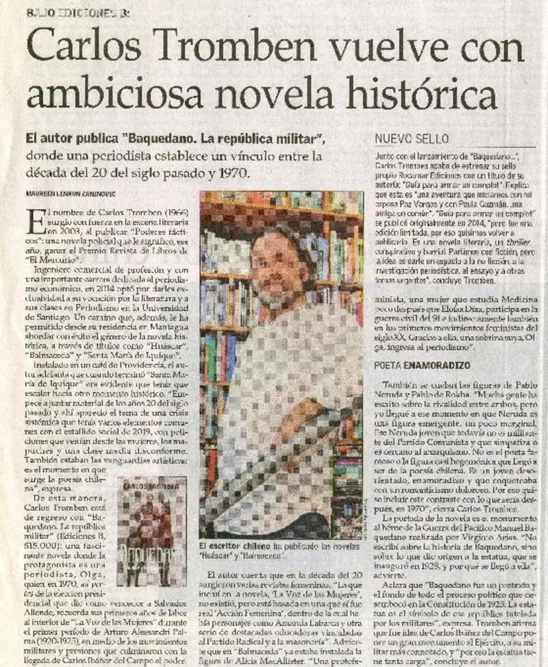 Carlos Tromben vuelve con ambisiosa novela histórica [artículo] Maureen Lennon Zaninovic.