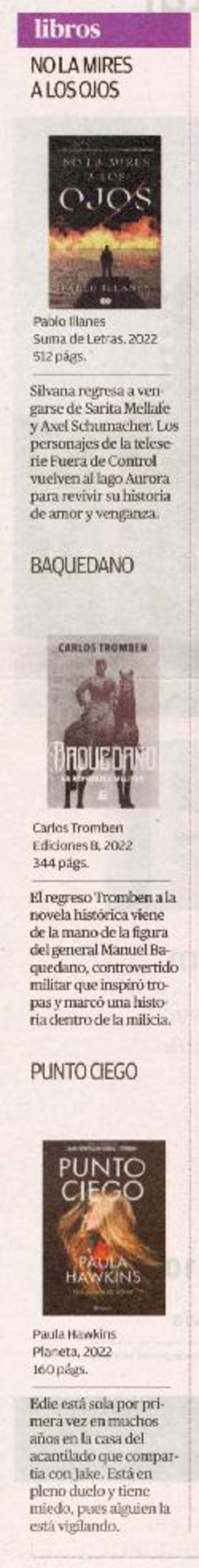 Autores chilenos - Illanes, Pablo - Tromben, Carlos - Punto ciego - Autoras britanicas - Hawkins, Paula - No la mires a los ojos - Baquedano la Republica militar