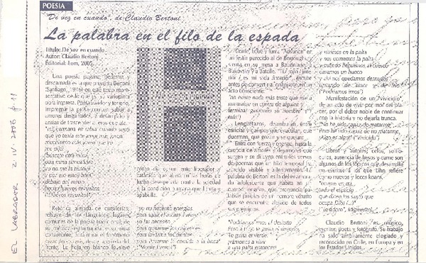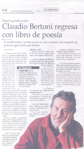 Claudio Bertoni regresa con libro de poesía (entrevista) [artículo] Nicolás Poblete.