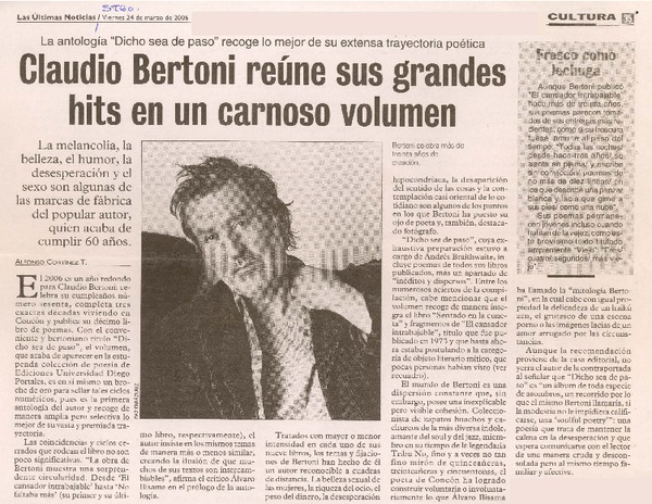Claudio Bertoni reúne sus grandes hits en un carnoso volumen [artículo] Alfonso Cortínez T.