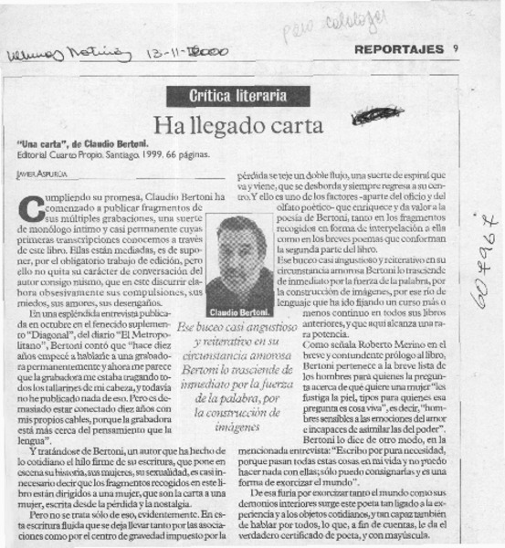 Autores chilenos - Bertoni Lemus, Claudio - Carta