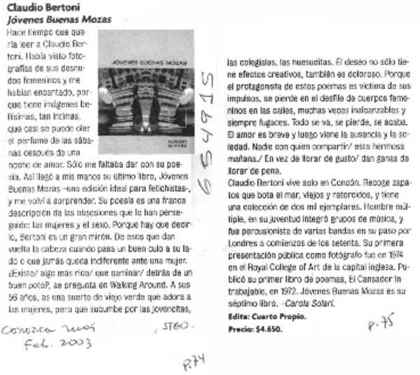 Autores chilenos - Bertoni Lemus, Claudio - Jóvenes buenas mozas