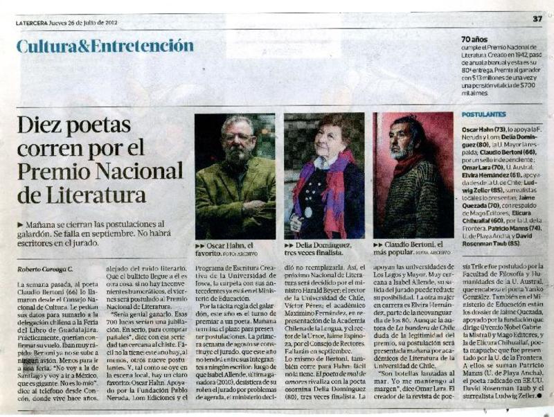 Diez poetas corren por el premio nacional de literatura [artículo] Roberto Careaga C.