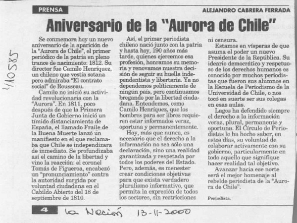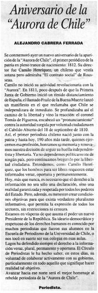 Aniversario de la "Aurora de Chile" [artículo] Alejandro Cabrera Ferrada