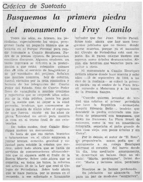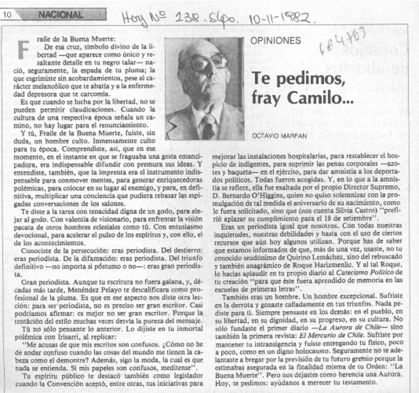 Te pedimos, fray Camilo... [artículo] Octavio Marfan.