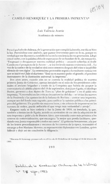 Camilo Henríquez y la primera imprenta [artículo] Luis Valencia Avaria.