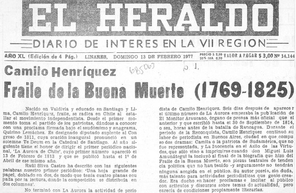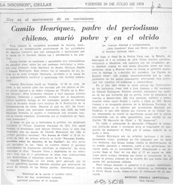 Camilo Henríquez, padre del periodismo chileno, murió pobre y en el olvido [artículo] Benicio Arzola Sepúlveda.