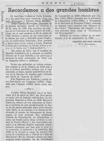 Recordemos a dos grandes hombres [artículo] Virginia Escobar Cruces.
