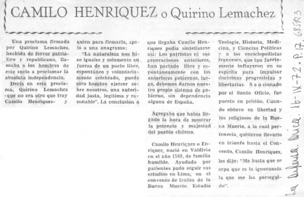 Camilo Henríquez o Quirino Lemachez. [artículo]