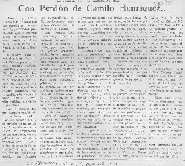 Con perdón de Camilo Henríquez [artículo] Luis Méndez Mella.
