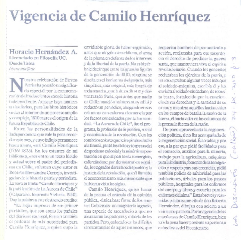 Vigencia de Camilo Henríquez [artículo] Horacio Hernández A.