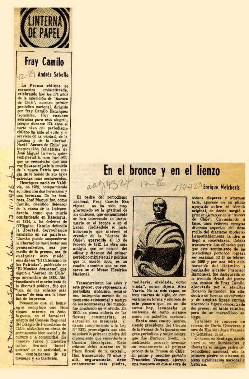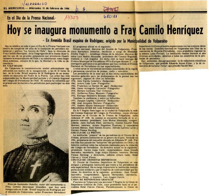 Hoy se inaugura monumento a Fray Camilo Henríquez. [artículo]