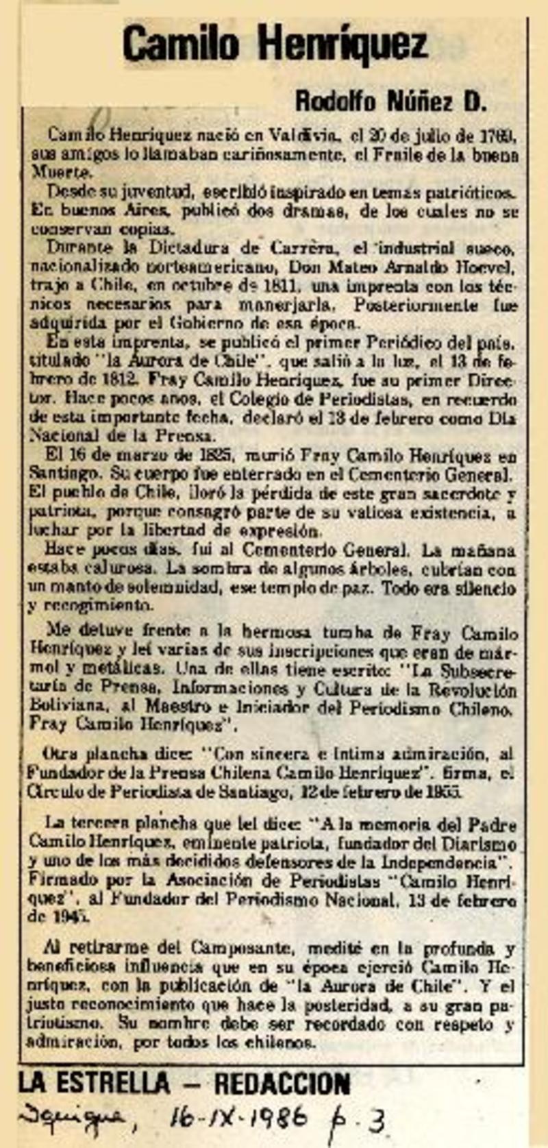 Camilo Henríquez [artículo] Rodolfo Núñez D.