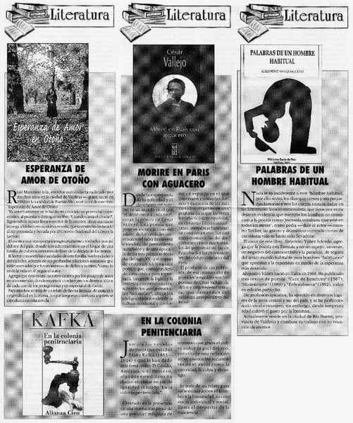 Manzano Isla, Raúl - Moriré en París con aguacero - Vallejo, César - Kafka, Franz - Autores chilenos - Palabras de un hombre habitual - Yanez Salcedo, Alejandro - Esperanza de amor de otoño - En la colonia penitenciaria - Autores austríacos - Autores peruanos