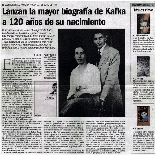 Lanzan la mayor biografía de Kafka a 120 años de su nacimiento [artículo] R.G.M.