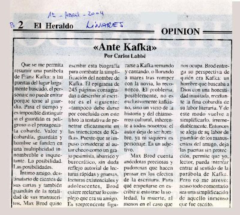 "Ante Kafka" [artículo] Carlos Labbé.