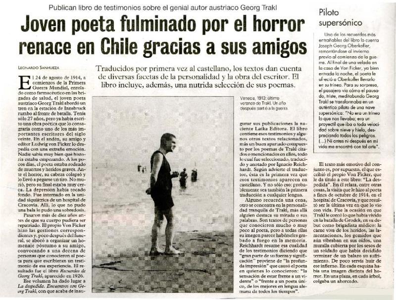 Joven poeta fulminado por el horror renace en Chile gracias a sus amigos [artículo] Leonardo Sanhueza.