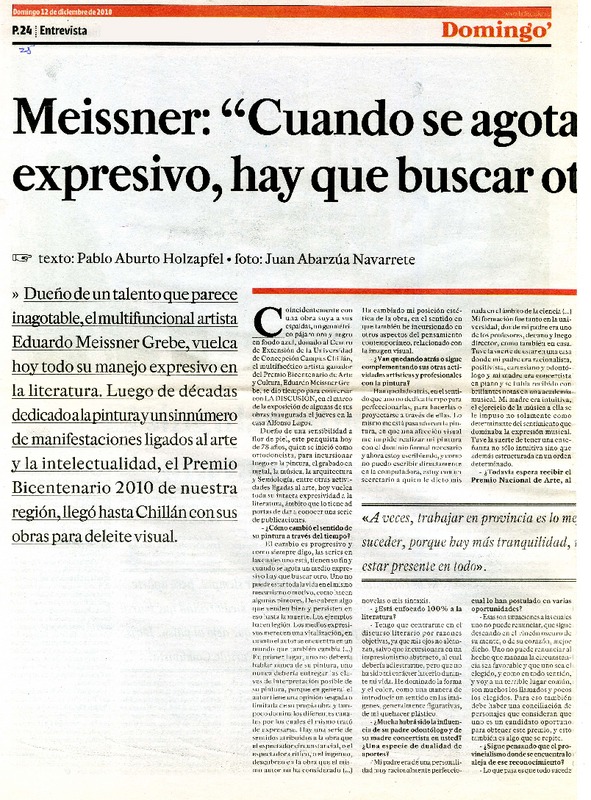 Cuando se agota un medio expresivo, hay que buscar otro (entrevista) [artículo] Pablo Arturo Holzapfel.