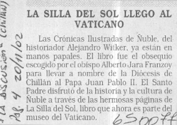 La silla del sol llegó al vaticano [artículo]