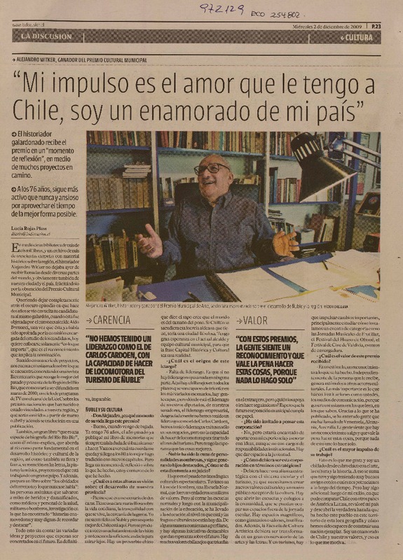 "Mi impulso es el amor que le tengo a Chile, soy un enamorado de mi país" (entrevista) [artículo] Lucía Rojas Plass.
