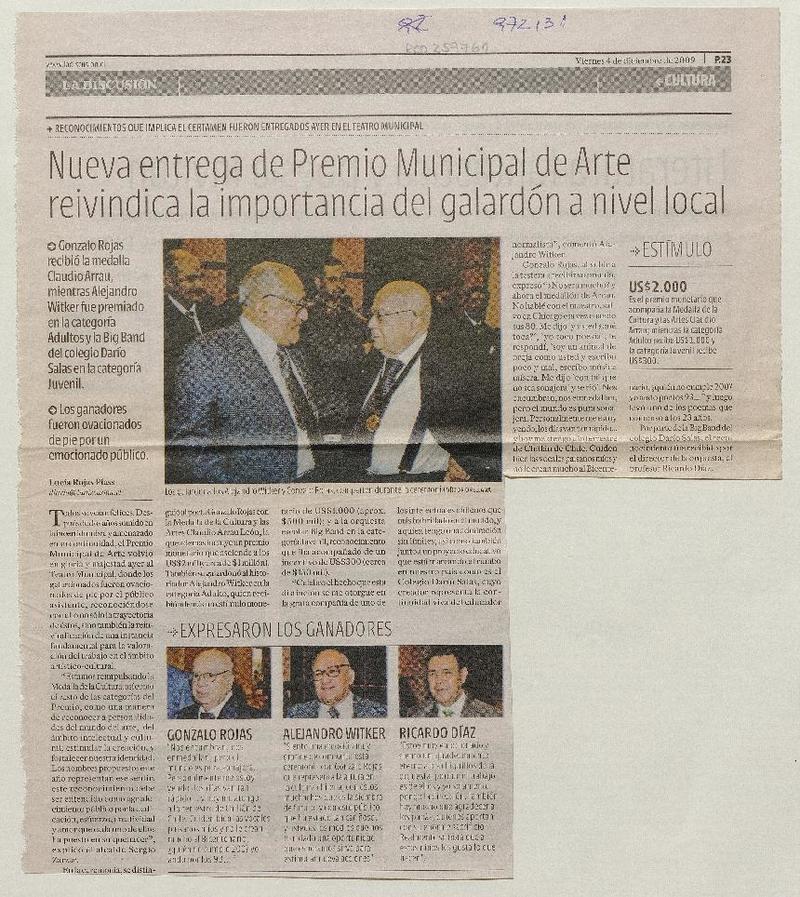 Nueva entrega de Premio Municipal de Arte reivindica la importancia del galardón a nivel local [artículo] Lucía Rojas Plass.