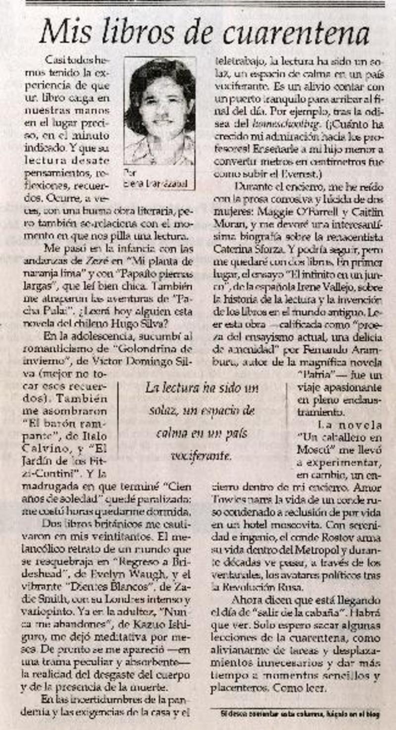 Mis libros de cuarentena [artículo] Elena Irarrázabal.