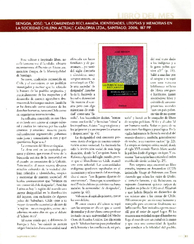Los libros de José Bengoa [artículo] Wellington Rojas Valdebenito.
