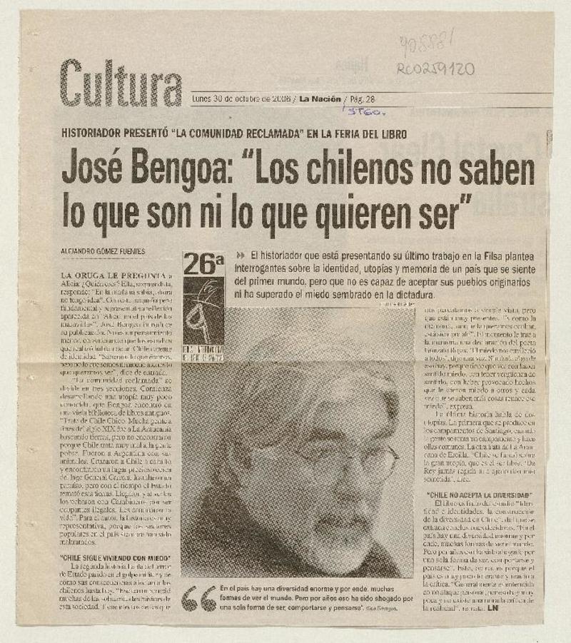 José Bengoa: "Los chilenos no saben lo que son ni lo que quieren ser" [artículo]Alejandro Gómez Fuentes.