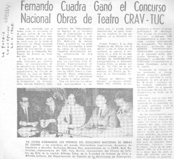 Fernando Cuadra ganó el concurso nacional obras de teatro CRAV-TUC. [artículo].