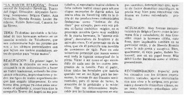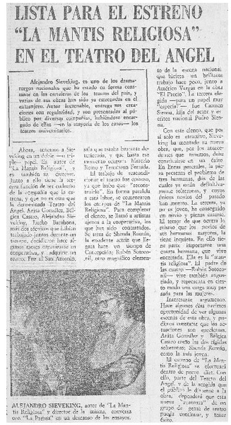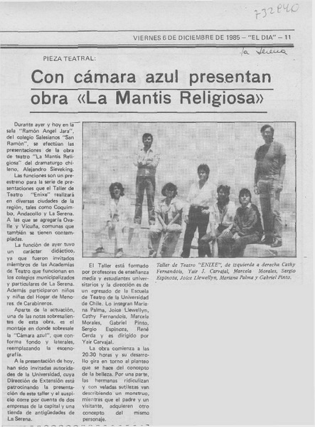 Con la cámara azul presentan obra "la mantis religiosa". [artículo] Andrés Sabella.