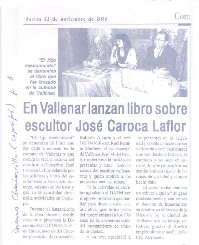 En Vallenar lanzan libro sobre escultor José Carroza Laflor [artículo].