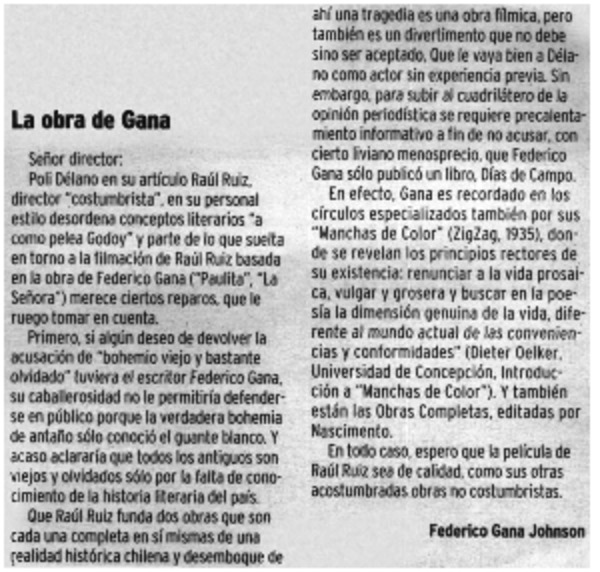 Raúl Ruiz dirigirá la película sobre Gabriela Mistral [artículo] Fernando Zavala.