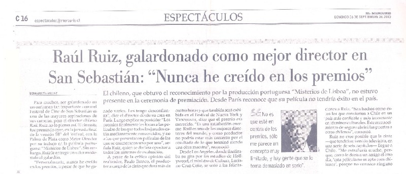 Raúl Ruiz triunfa en Festival de San Sebastián con maratónica película [artículo] Jorge Letelier.