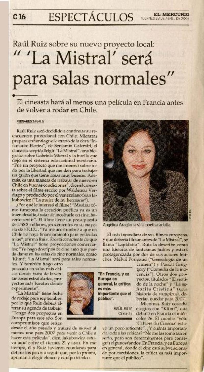"'La Mistral' será para salas normales" [artículo] Fernando Zavala.