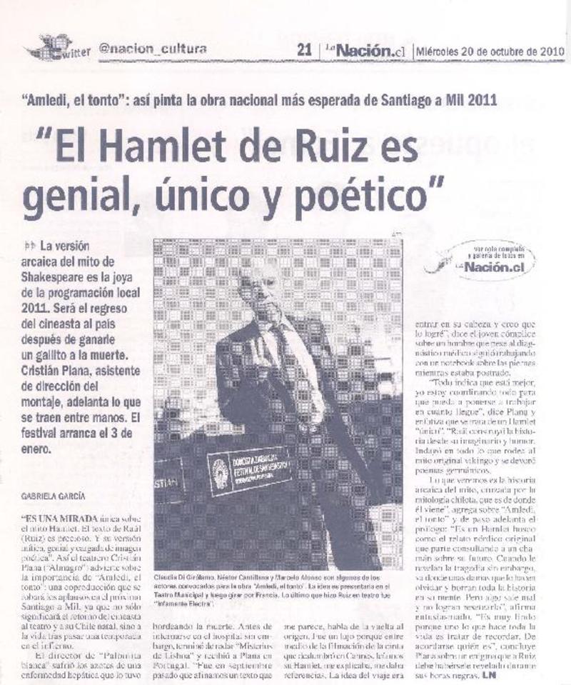 "El Hamlet de Ruiz es genial, único y poético" [artículo] Gabriela García.