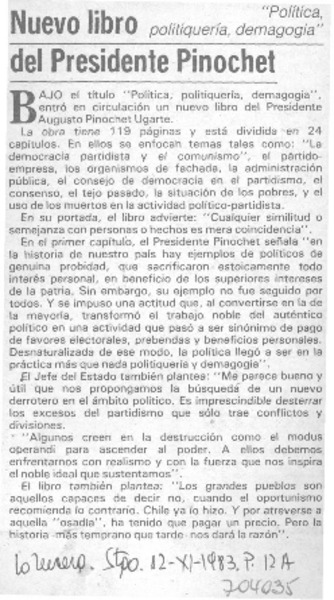 Libro de Pinochet: "Políticos, politiquería, demagogia". [artículo]